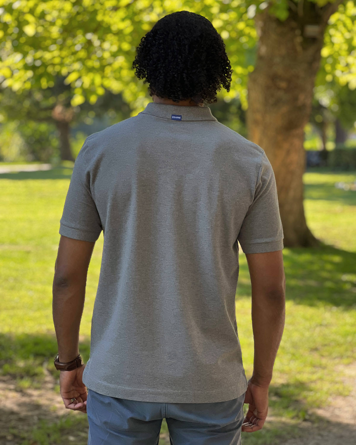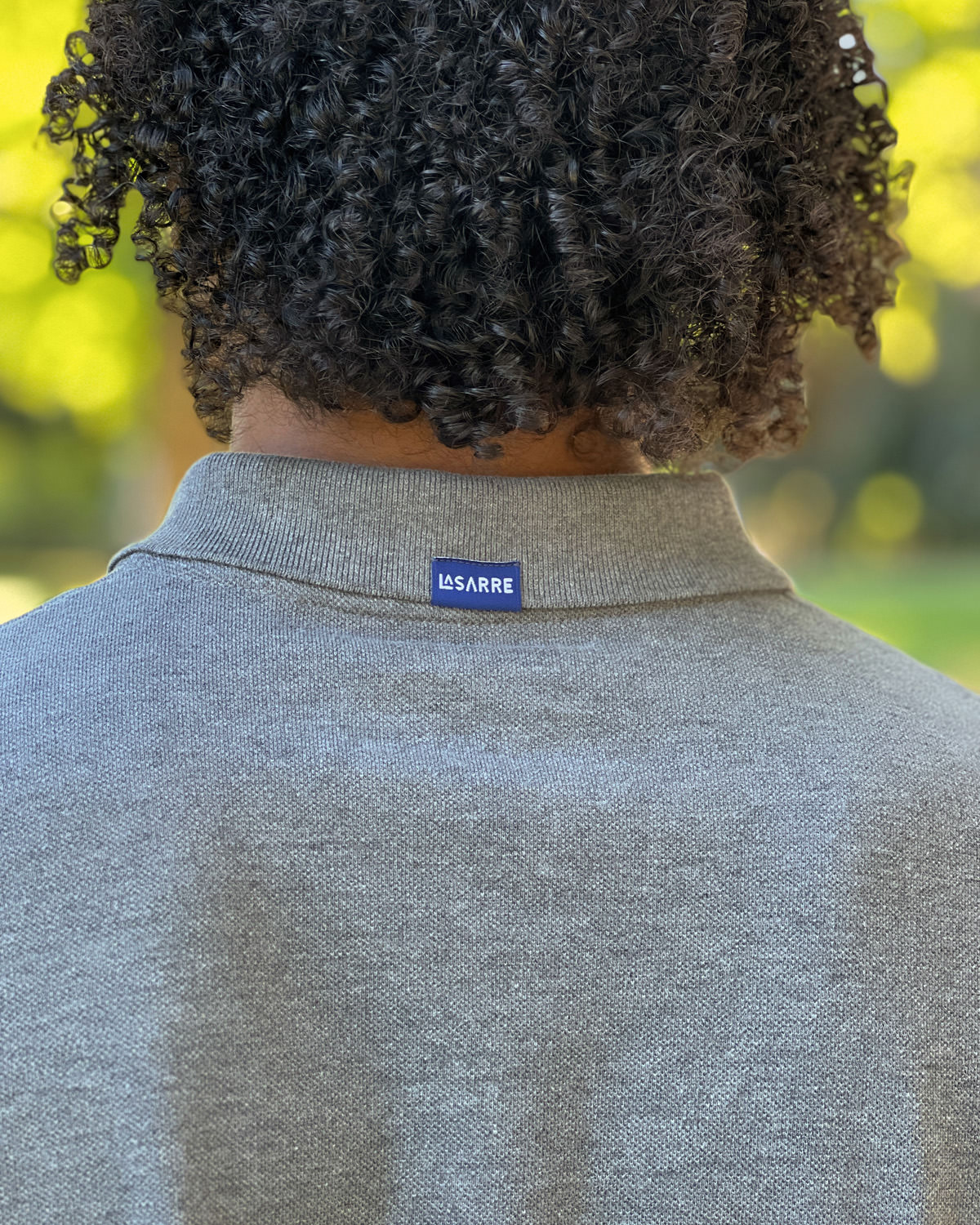 Zwei LA SARRE-Saumlabels komplettieren das hochwertige Design. Eins hinten am Kragen und ein weiteres am Saum auf der Vorderseite des Shirts.